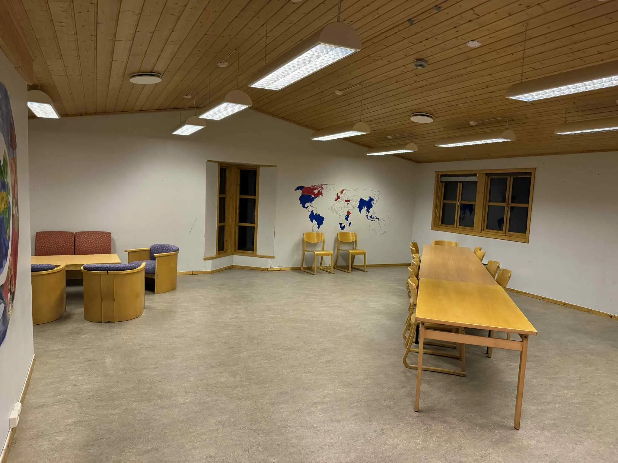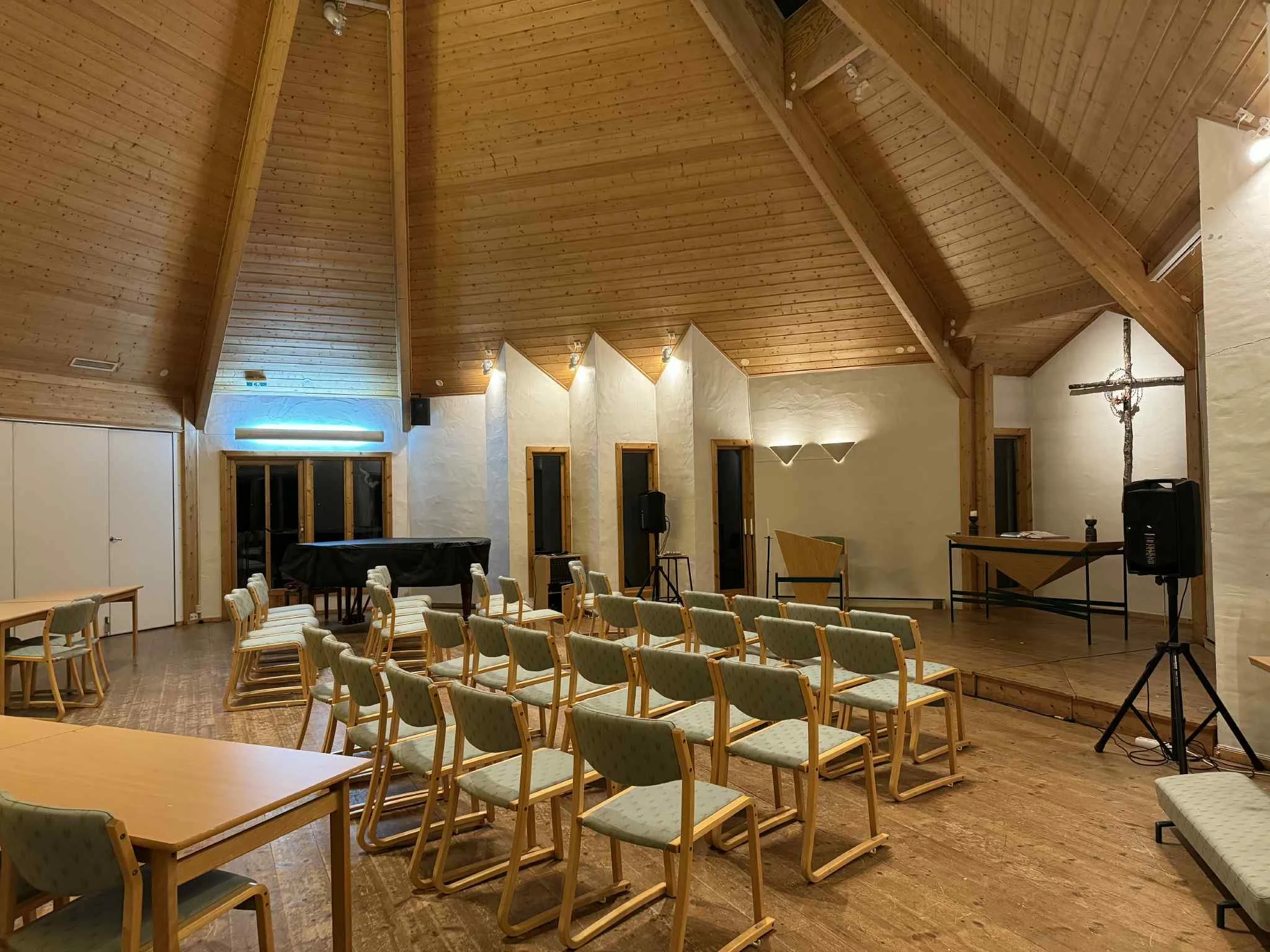 Det er klasserom/møterom ved siden av bygget og et kapell som kan brukes til møterom, sanglokale o.l. Kapellet har en fantastisk akustikk og et Steinfeld-flygel. Fyll inn kontaktskjema for booking eller andre spørsmål.